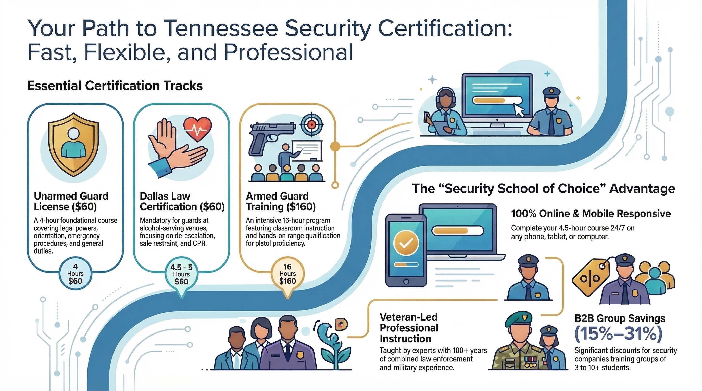 In terms of a career "buy-in," security is arguably the most efficient investment in the Tennessee labor market. The total cost to get licensed is often lower than a single night out in town, yet it unlocks a stable income stream with an average hourly rate of $18/hour, plus benefits such as medical, dental, and vacation.